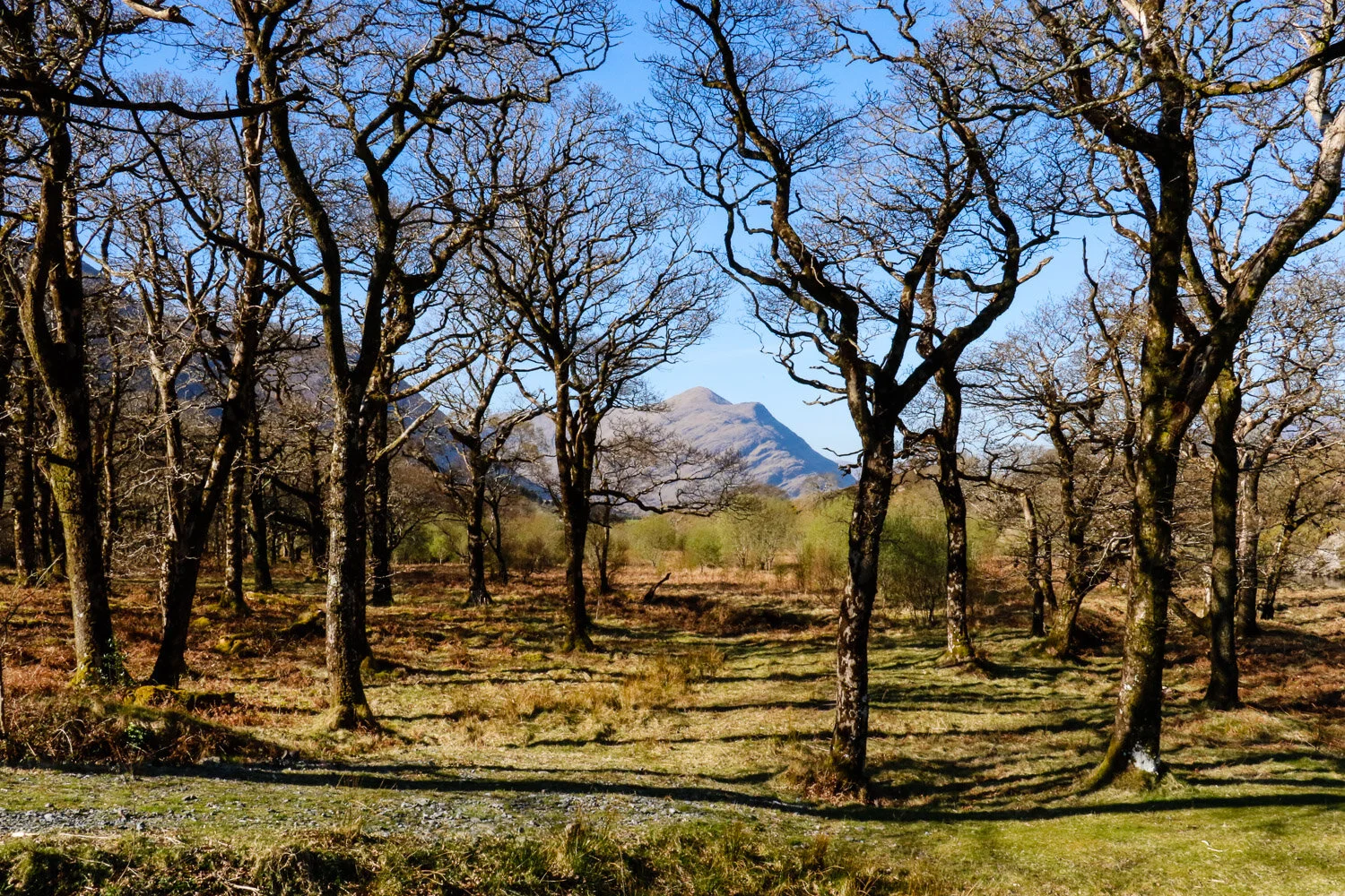 View of Croagh Patrick from between trees in Co. Mayo, Ireland.
