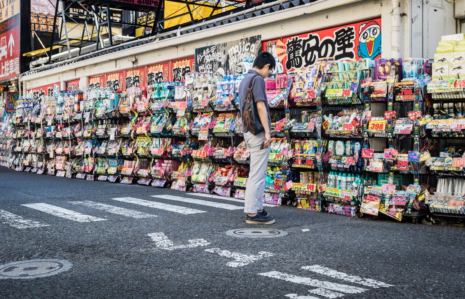 A young man looks at hundreds of products outside at a market in Shinjuku, Tokyo Japan.