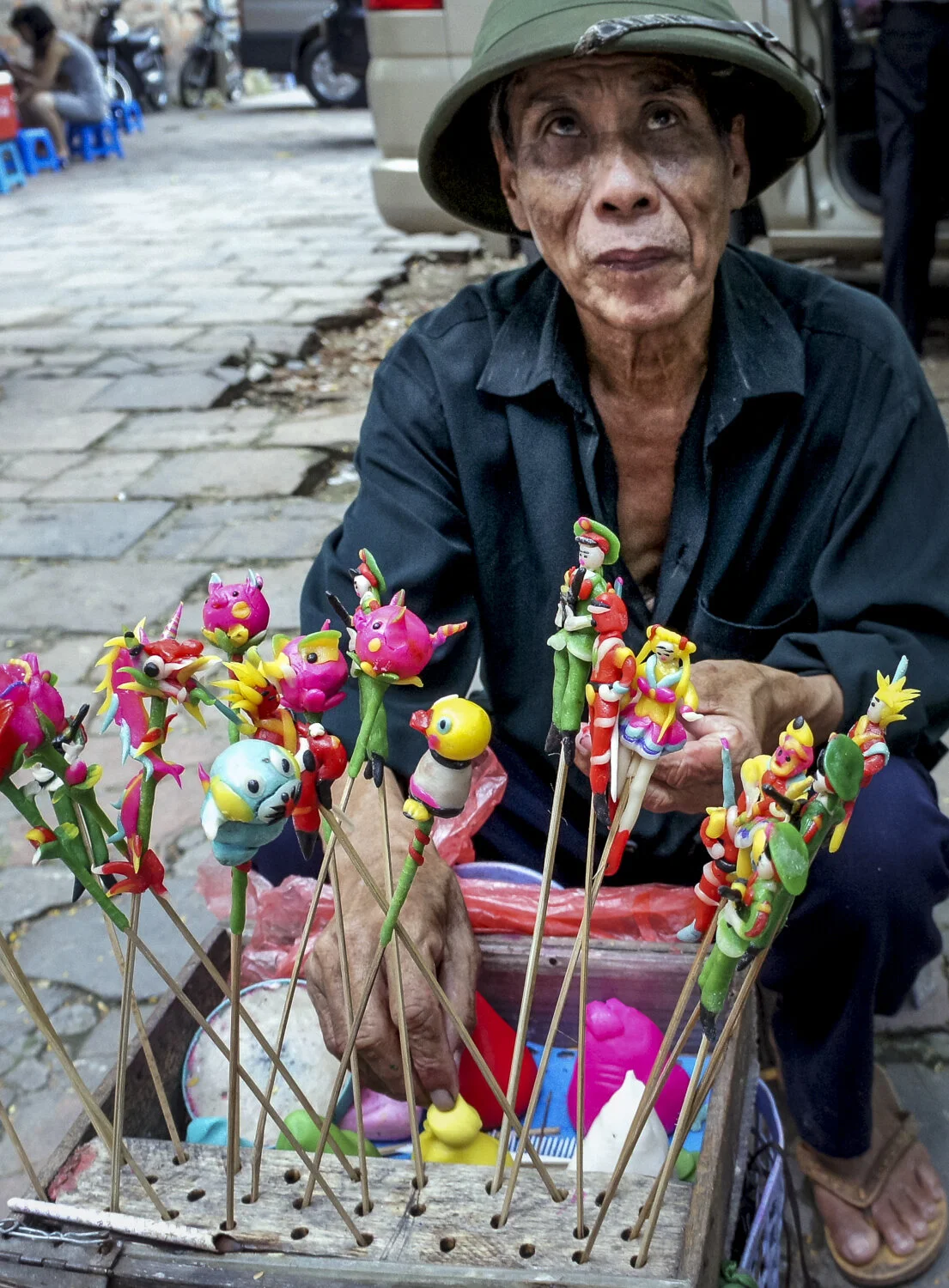 A man sells colorful figures on the sidewalk in Hanoi, Vietnam.