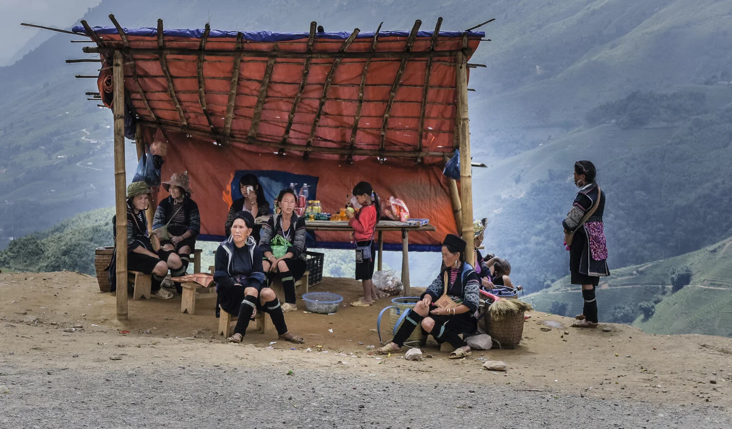 A local market where Black H'mong women sell their intricately embroidered textiles in Sapa, Vietnam.