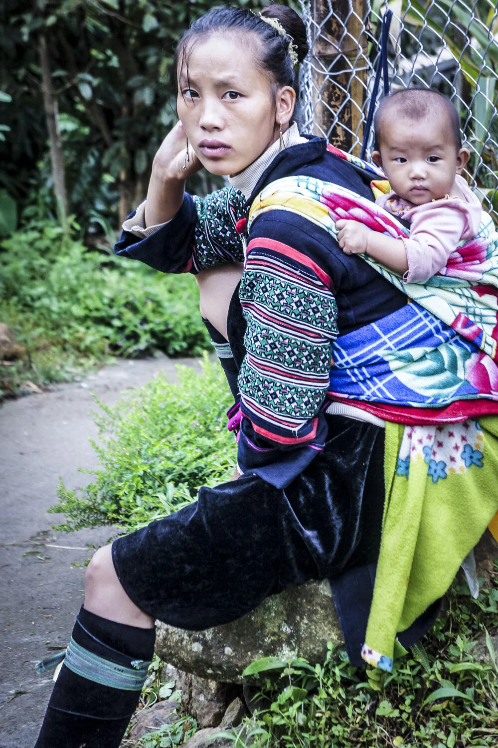 A Black H'mong woman and her baby wait by the side of the road to Sapa, Vietnam.